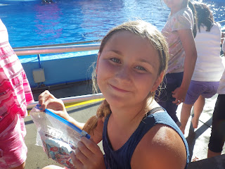 And here she's telling me about the moment that just may have solidified her desire to become a marine biologist...she was asked to be in the show!! They asked if she'd be ok with touching the dolphins, the fish, and getting wet. She was so excited!!
